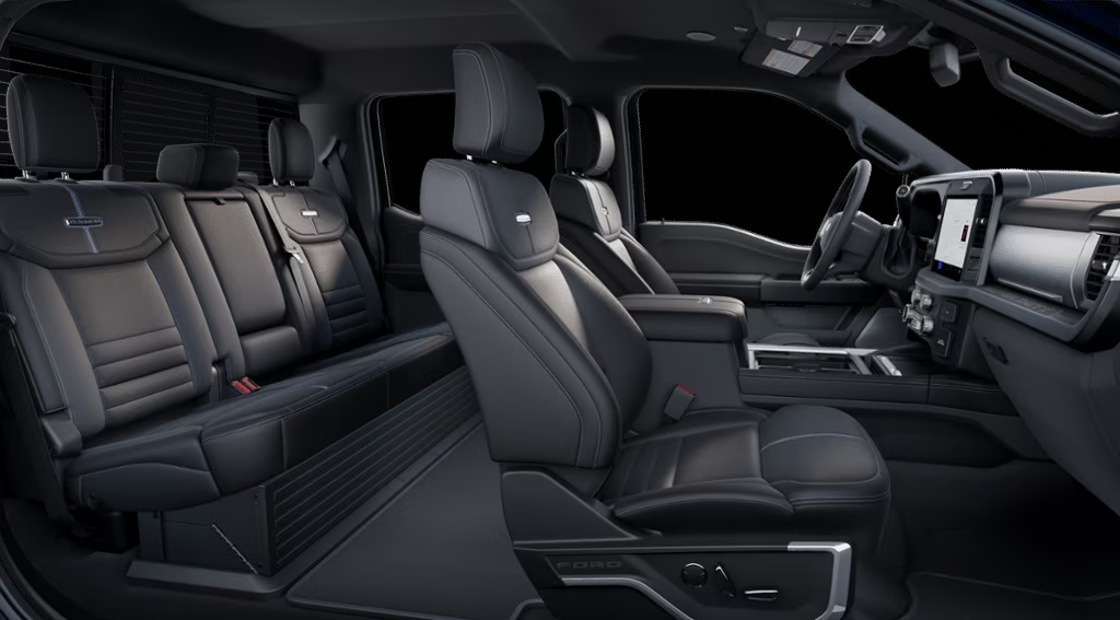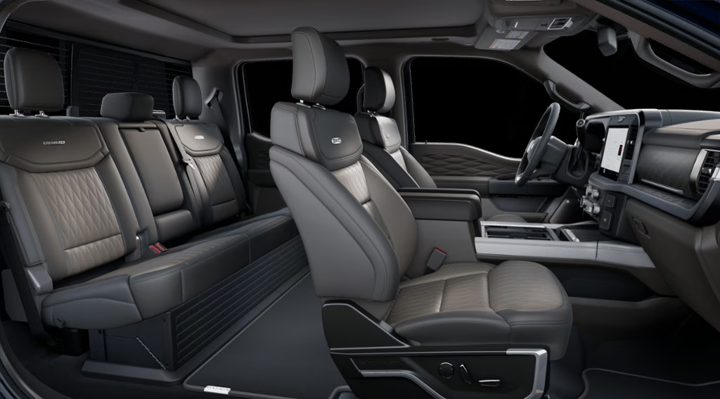 Inside, the Platinum offers a luxurious cabin with premium leather seating, brushed metal and wood accents, and a spacious crew cab layout. A large touchscreen infotainment system, digital instrument cluster, premium audio system, and advanced connectivity features provide both comfort and modern technology for drivers and passengers.